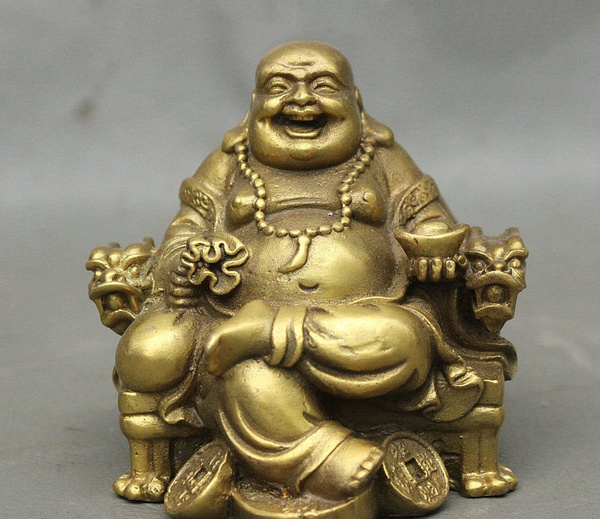 Chinese Brass Sit Dragon Chair Wealth Money Happy Laugh Maitreya Buddha Statue